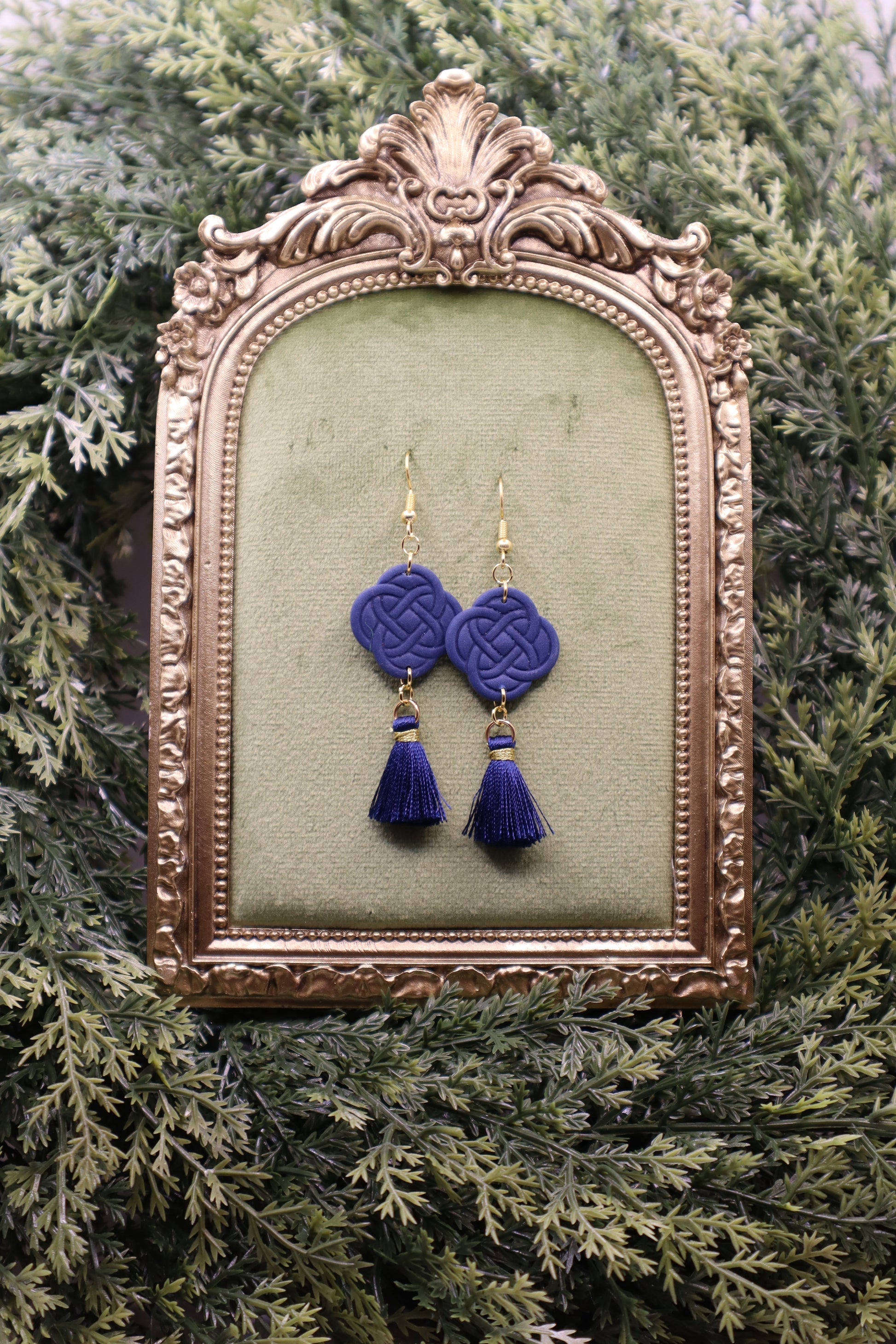 Cute and versatile stylish navy Celtic style earrings with navy tassel. Made with polymer clay and gold plated stainless steel hooks.