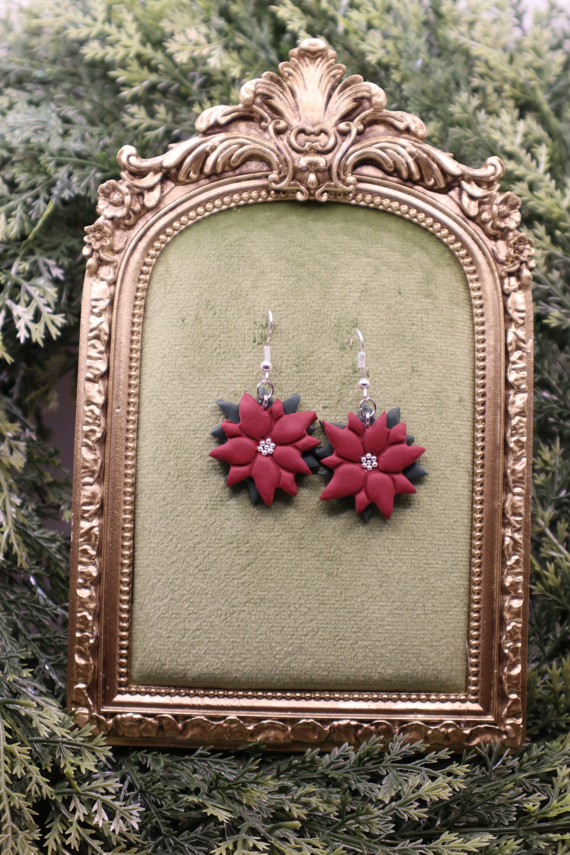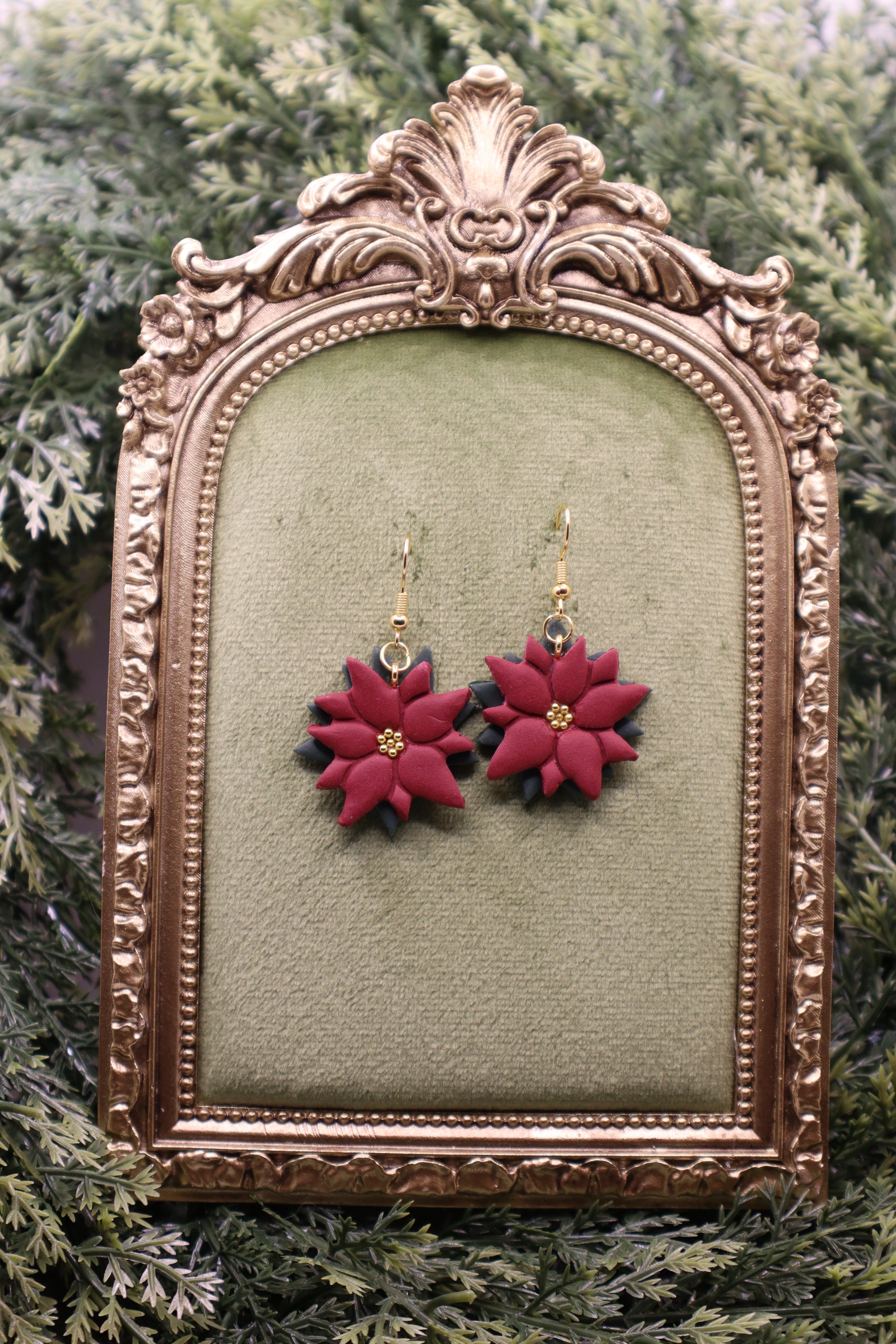 Handcrafted poinsettia earrings - a festive favourite for the holiday season. Each pair is carefully crafted from lightweight polymer clay in rich burgundy and deep green hues, accented with golden or silvery bead centres for an elegant finish.